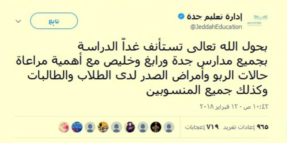 في وقت أعلنت الإدارة العامة للتعليم بمنطقة مكة المكرمة وجامعة أم القرى، وتعليم وجامعات المدينة المنورة استمرار تعليق الدراسة اليوم (الثلاثاء)، امتثالا للتنبيه المتقدم الصادر من هيئة الأرصاد وحماية البيئة، عن سرعة الرياح بأكثر من 55 كيلومترا في الساعة، وتحذير المديرية العامة للدفاع المدني وحرس الحدود من خطورة الحالة الجوية، أكدت الإدارة العامة للتعليم في جدة استئناف الدراسة اليوم (الثلاثاء) في جميع مدارس جدة، ورابغ، وخليص، مشددة في الوقت ذاته عبر بيانها في «تويتر» على أهمية مراعاة حالات الربو وأمراض الصدر لدى الطلاب والطالبات وجميع منسوبي المدارس.