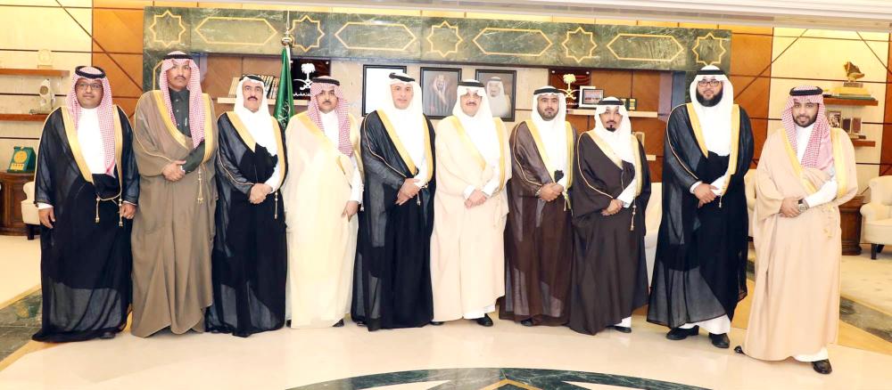 الأمير سعود بن نايف يتوسط رئيس وأعضاء بلدي الجبيل. (عكاظ)