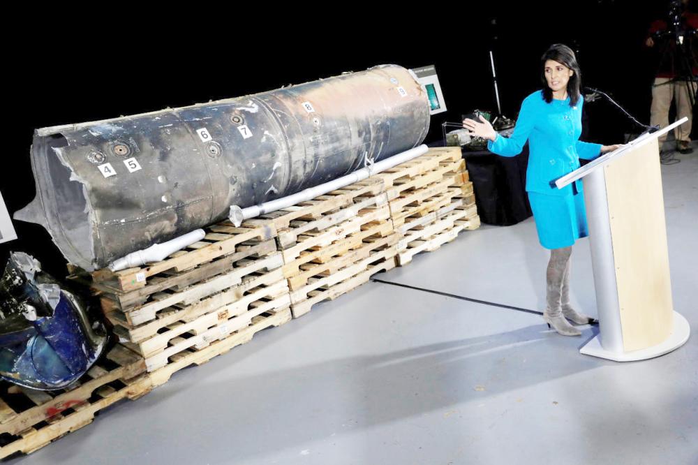 نيكي هايلي تشير إلى حطام صاروخ إيراني أطلقته ميليشيا الحوثي على الأراضي السعودية. (أرشيفية)