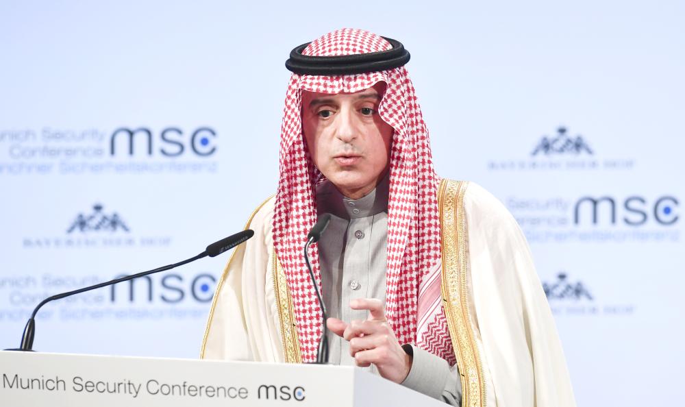 الجبير متحدثا أمام مؤتمر الأمن في ميونخ أمس. (أ.ف.ب)