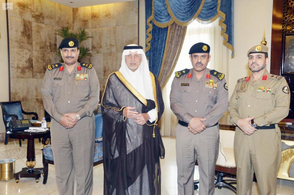 الأمير خالد الفيصل مع المرقيين ومدير شرطة المنطقة. (عكاظ)