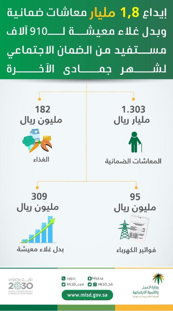 وتفصيلًا، بلغت المعاشات الضمانية للمستفيدين 1.303 مليار ريال، فيما بلغت المساعدات النقدية لأجل الغذاء 182 مليون ريال، بينما تم صرف 95 مليون ريال لسداد جزء من فواتير الكهرباء، إضافة إلى 309 ملايين ريال بدل غلاء معيشة.