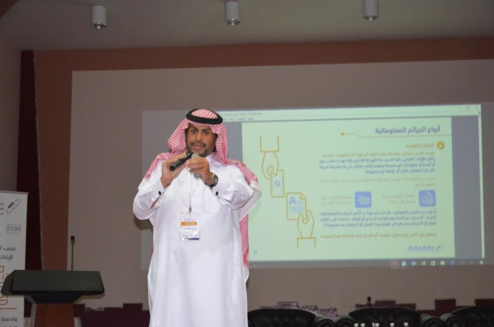 وقدم المستشار القانوني لهيئة الاتصالات وتقنية المعلومات صالح بن علي الربيعة، عرضاً مرئياً حول الجرائم المعلوماتية وأنواعها، ومخاطرها، وسبل الوقاية منها، وخطوات الإبلاغ عنها، مُستعرضاً نظام مكافحة جرائم المعلوماتية.