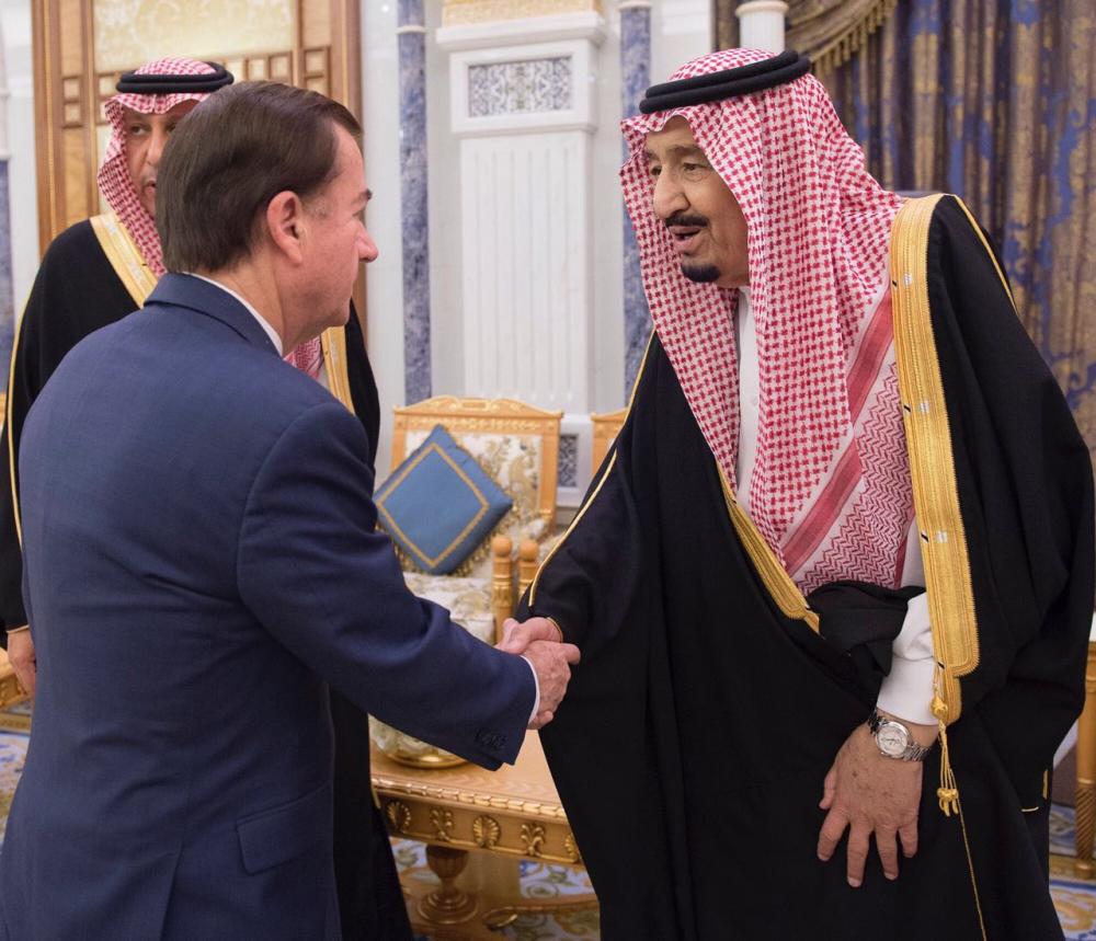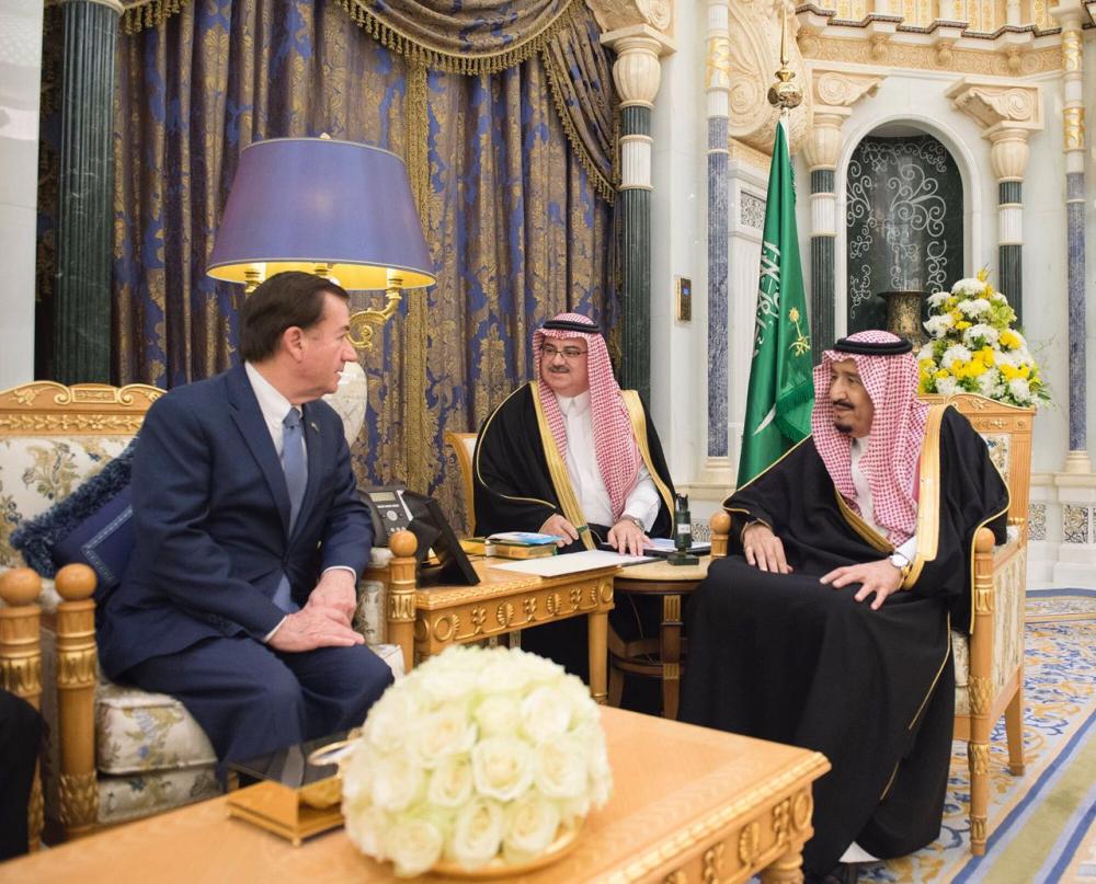 استقبل خادم الحرمين الشريفين الملك سلمان بن عبدالعزيز آل سعود في مكتبه بقصر اليمامة في الرياض اليوم، رئيس لجنة الشؤون الخارجية في مجلس النواب الأمريكي إد رويس.