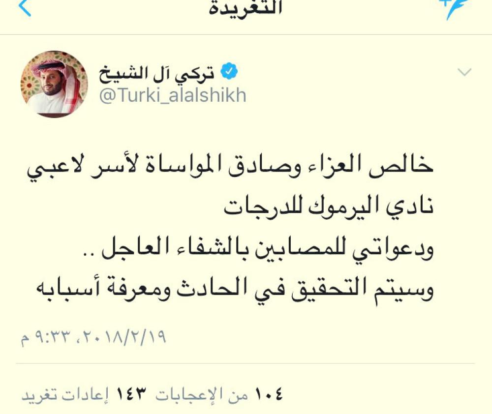 من جهة أخرى، بعث رئيس الهيئة العامة للرياضة تركي آل الشيخ عبر حسابه في موقع التواصل الاجتماعي «تويتر» خالص التعازي والمواساة لأسر لاعبي نادي اليرموك للدراجات، داعيا للمصابين بالشفاء العاجل موجها بالتحقيق في الحادثة ومعرفة أسبابها.