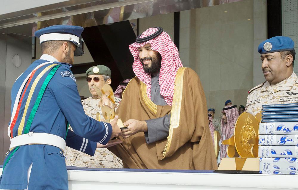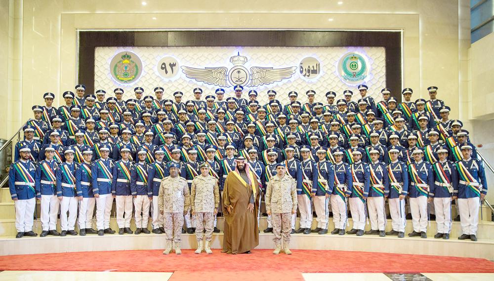 وشاهد ولي العهد العرض الجوي للصقور السعودية، خلال رعايته حفلة تخريج الدفعة الـ93 من طلبة الكلية.وكان في استقبال ولي العهد لدى وصوله مقر الكلية نائب أمير منطقة الرياض الأمير محمد بن عبدالرحمن، ورئيس هيئة الأركان العامة الفريق أول ركن عبدالرحمن البنيان، وقائد القوات الجوية الملكية السعودية المكلف اللواء الطيار ركن محمد العتيبي، وقائد كلية الملك فيصل الجوية اللواء طيار ركن خالد اللعبون.