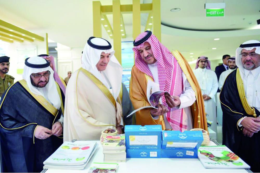 أمير المدينة مطلعا على كتيب الفرص الاستثمارية بحضور وزير البيئة والمياه والزراعة. (عكاظ)