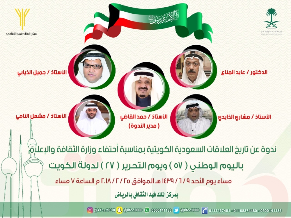 تحتفي وزارة الثقافة والإعلام غدا الأحد باليوم الوطني 57 ويوم التحرير 27 لدولة الكويت، من خلال ندوة عن تاريخ العلاقات السعودية - الكويتية، تعقدها في السابعة مساء غدٍ (الأحد)، في مركز الملك فهد الثقافي بالرياض.