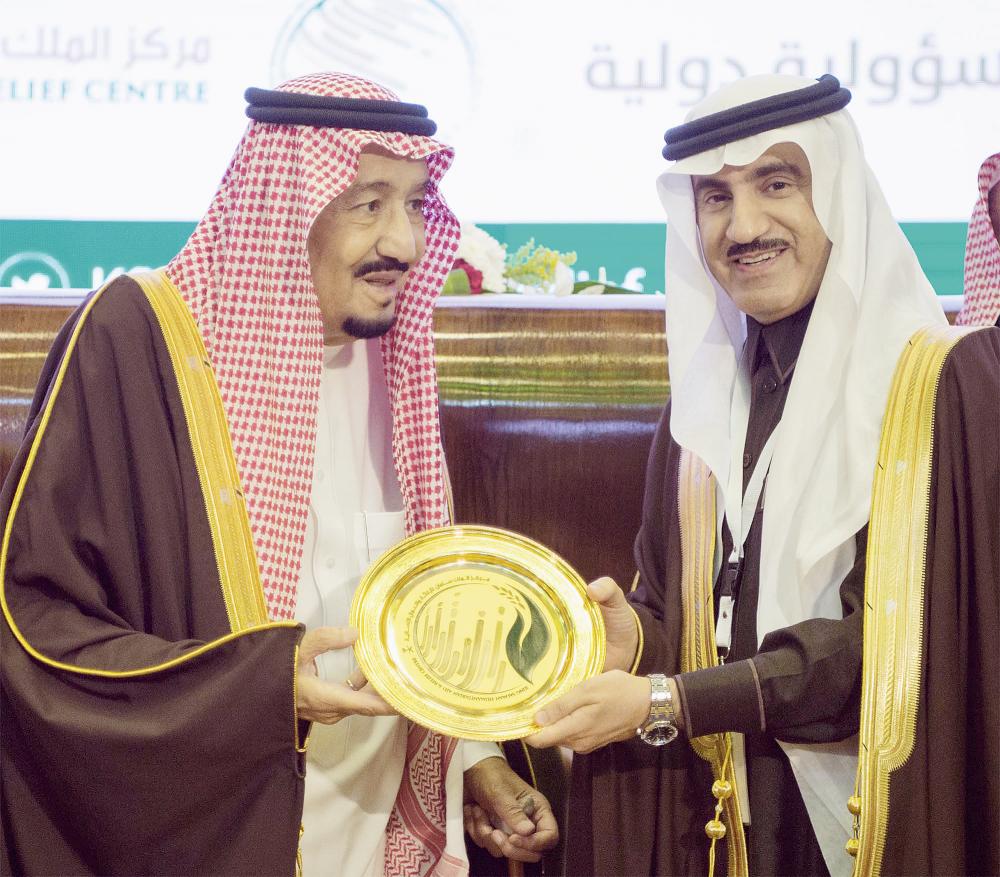وكان في استقبال خادم الحرمين الشريفين لدى وصوله مقر الحفل أمير منطقة الرياض الأمير فيصل بن بندر بن عبدالعزيز، ونائبه الأمير محمد بن عبدالرحمن بن عبدالعزيز، والمشرف العام على مركز الملك سلمان للإغاثة والأعمال الإنسانية المستشار في الديوان الملكي الدكتور عبدالله بن عبدالعزيز الربيعة، وعدد من المسؤولين.