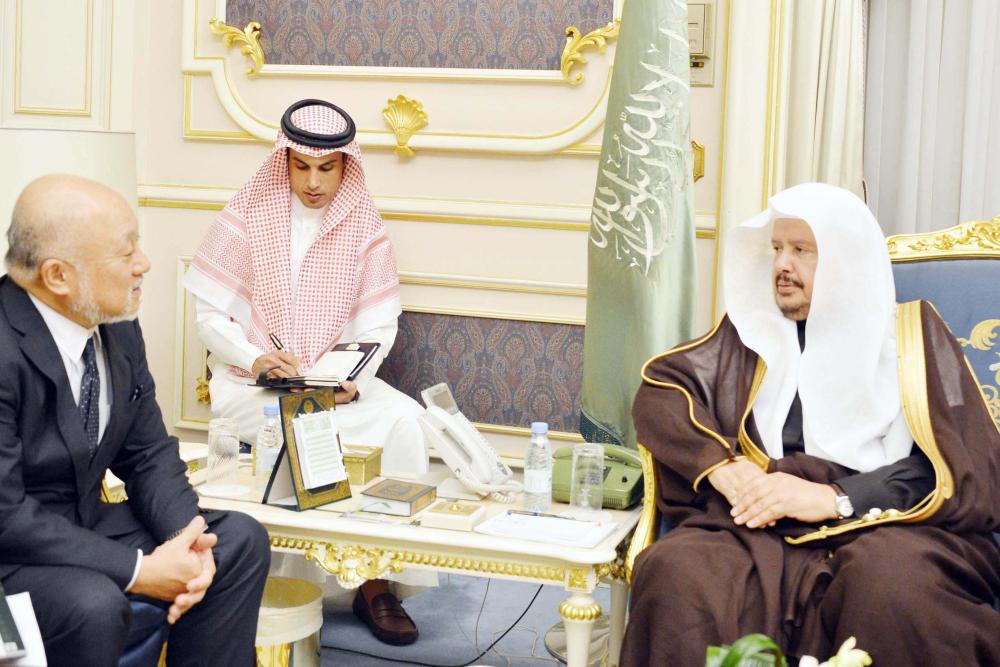 آل الشيخ مستقبلاً السفير الياباني المعين لدى المملكة تسوكاسا إيمورا، أمس في الرياض. (عكاظ)