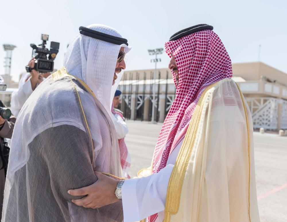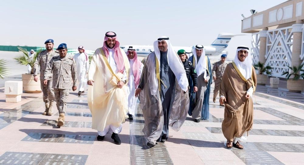 وكان في استقباله بمطار قاعدة الملك سلمان الجوية، الأمير تركي بن محمد بن فهد بن عبدالعزيز المستشار بالديوان الملكي، والشيخ ثامر جابر الأحمد الصباح سفير دولة الكويت لدى المملكة، وقائد قاعدة الملك سلمان الجوية بالقطاع الأوسط اللواء الطيار ركن صالح بن عبدالله بن طالب، ومندوب عن المراسم الملكية.