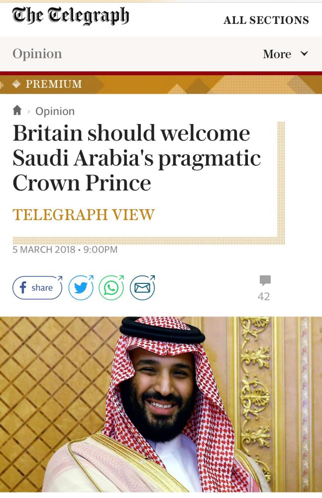 كشفت صحيفة «التليغراف» البريطانية في افتتاحية نشرتها اليوم (الثلاثاء)، وعبرت بها عن وجهة نظرها حيال زيارة ولي العهد الأمير محمد بن سلمان المرتقبة إلى بريطانيا، أن على لندن الترحيب بولي العهد خلال هذا الزيارة.