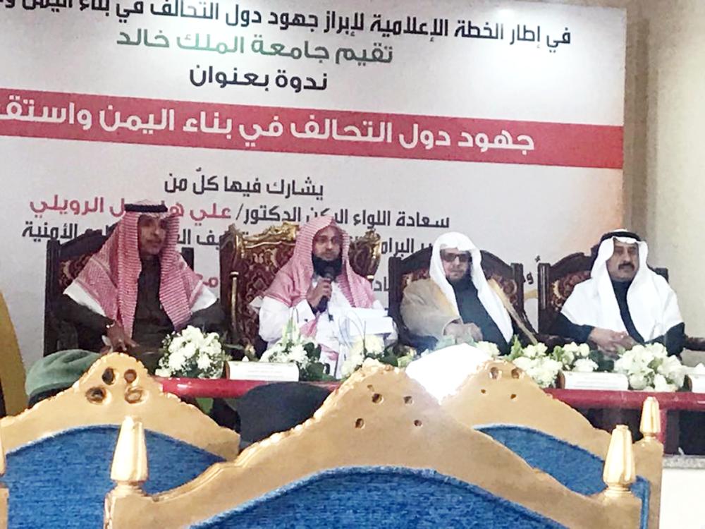 نظم فرع جامعة الملك خالد في ظهران الجنوب صباح أمس (الثلاثاء) ندوة تعريفية بجهود دول التحالف في بناء اليمن واستقراره، على مسرح متوسطة طلحة بن عبيدالله بالطلحة، أدارها عميد كلية العلوم والآداب بظهران الجنوب الدكتور مسفر الوادعي، بمشاركة مدير البرامج التدريبية بجامعة الأمير نايف للعلوم الأمنية اللواء الركن الدكتور علي الرويلي، والمشرف على التوعية الفكرية بجامعة الملك خالد الدكتور يحيى البكري، ورئيس مركز تطوير القيادات الإدارية العليا الدكتور فيصل السميري.