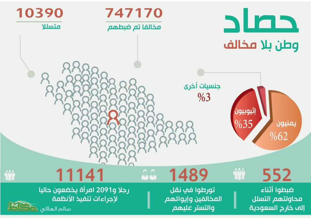 بلغ عدد من تم ضبطهم في حملة «وطن بلا مخالف» منذ بداية الحملة في شهر صفر الماضي وحتى أمس الأول (الخميس) في كافة المناطق 747170 مخالفا، منهم 530404 مخالفين لنظام الإقامة و 64433 لنظام أمن الحدود و 152333 مخالفا لنظام العمل. أما من تم ضبطهم أثناء محاولتهم التسلل فقد بلغ عددهم 10390، 62% منهم يمنيون، 35% إثيوبيون و 3% من جنسيات أخرى.