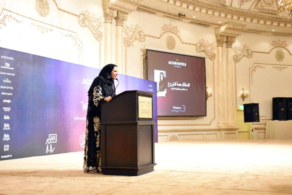 حصة المزروع مديرة فندق في الرياض تستعرض تجربتها للحاضرات في ملتقى تمكين المرأة الذي اختتم أعماله في جدة أخيرا.