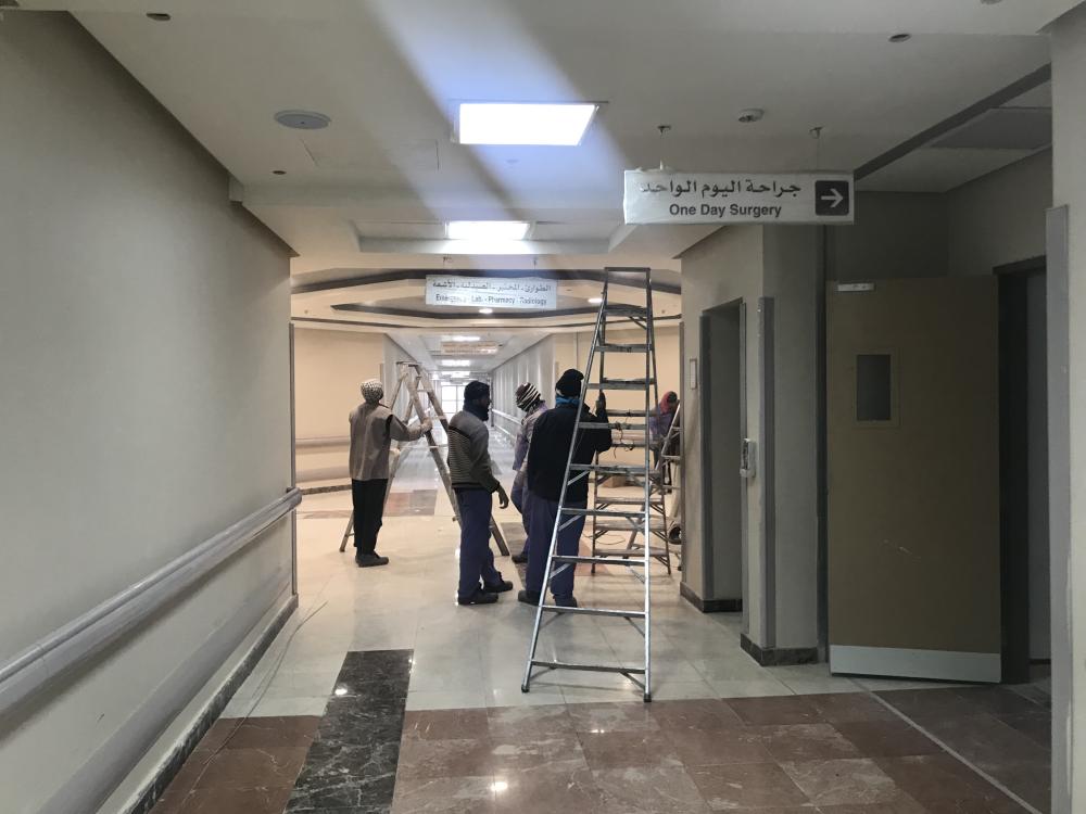وأوضح اكتمال التجهيزات في العيادات الخارجية، وما زال العمل جاريا لاستكمال التجهيزات والأنظمة واختياراتها، مبينا أن المبنى الرئيسي يحتوي على قسم الطوارئ، والعناية المركزة للكبار والصغار ومرضى القلب (25 سريرا للكبار، ومثلها للصغار، و10 لمرضى القلب)، ووحدة الحروق (10 أسرّة)، ووحدة المناظير، وغرف العمليات (15 غرفة، منها 7 لجراحات اليوم الواحد)، خلاف غرفة العمليات في الطوارئ للحالات المستعجلة، و4 أقسام داخلية في الأدوار كل واحد يحتوي على جناحين، وكل جناح 52 سريرا، من ضمنها 4 أسرّة عزل (104 أسرّة في الدور الواحد)، وأقسام الجراحة والأطفال والباطنية والأذن والحنجرة وجناح للأورام.