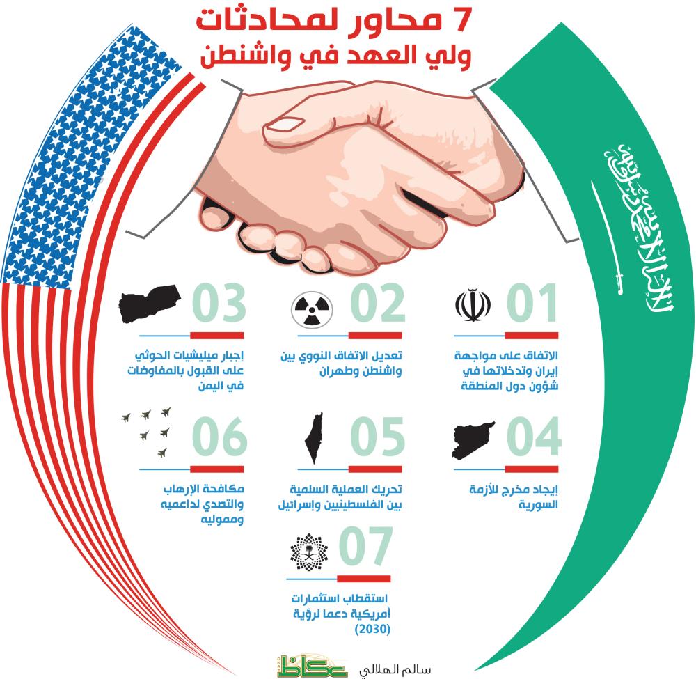 وتركز الملفات المطروحة للنقاش في واشنطن، خصوصا لقاء ولي العهد والرئيس الأمريكي دونالد ترمب، على ما فيه مصلحة البلدين الصديقين، بدءا من الاتفاق على مواجهة إيران وتدخلاتها في شؤون دول المنطقة، إلى تعديل الاتفاق النووي، وإجبار ميليشيات الحوثي على القبول بالمفاوضات في اليمن، وإيجاد مخرج للأزمة السورية، وتحريك العملية السلمية بين الفلسطينيين وإسرائيل، فضلا عن مكافحة الإرهاب والتصدي لداعميه ومموليه.