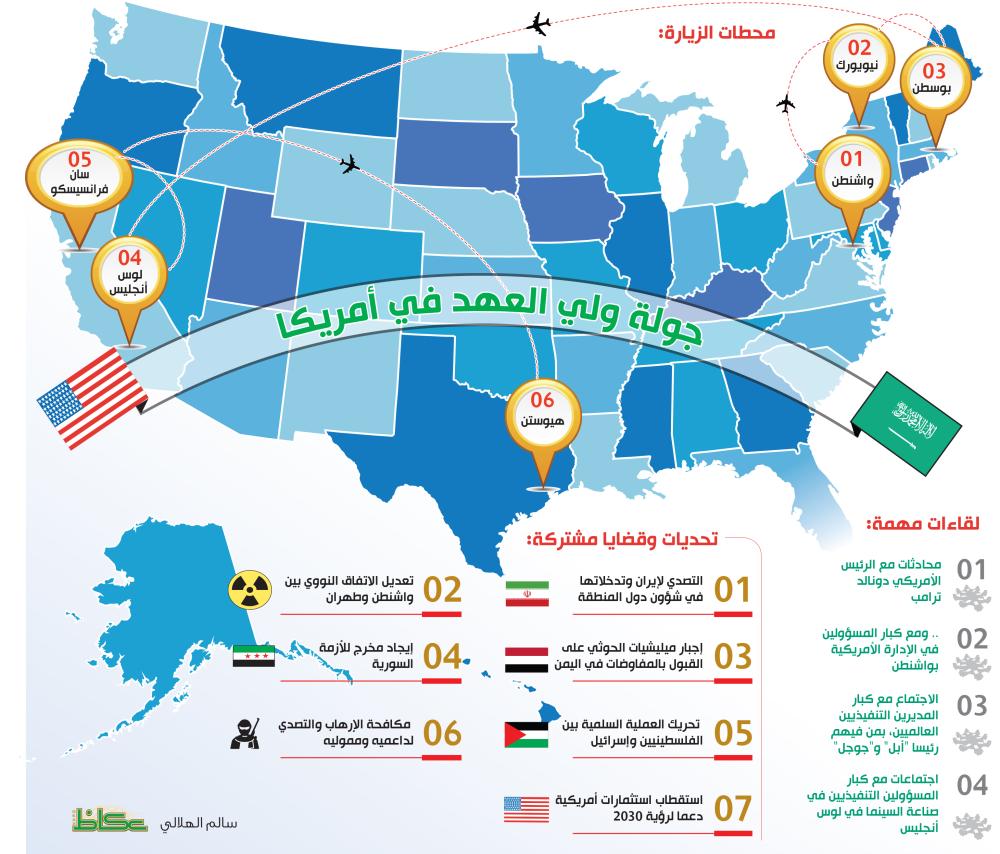 ولن تقتصر زيارة الأمير محمد بن سلمان على لقاء الرئيس الأمريكي دونالد ترمب، وكبار المسؤولين في الكونغرس ومراكز الفكر، بل ستركز أيضاً على تحقيق رؤيته (2030) من خلال جذب مزيد من الاستثمارات الأمريكية، حيث يلتقي مديري أكبر الشركات في السليكون فالي ومدينة سياتيل. كما سيزور -وفقا لـ«بلومبيرغ»- كلاً من نيويورك وبوسطن وهيوستن.