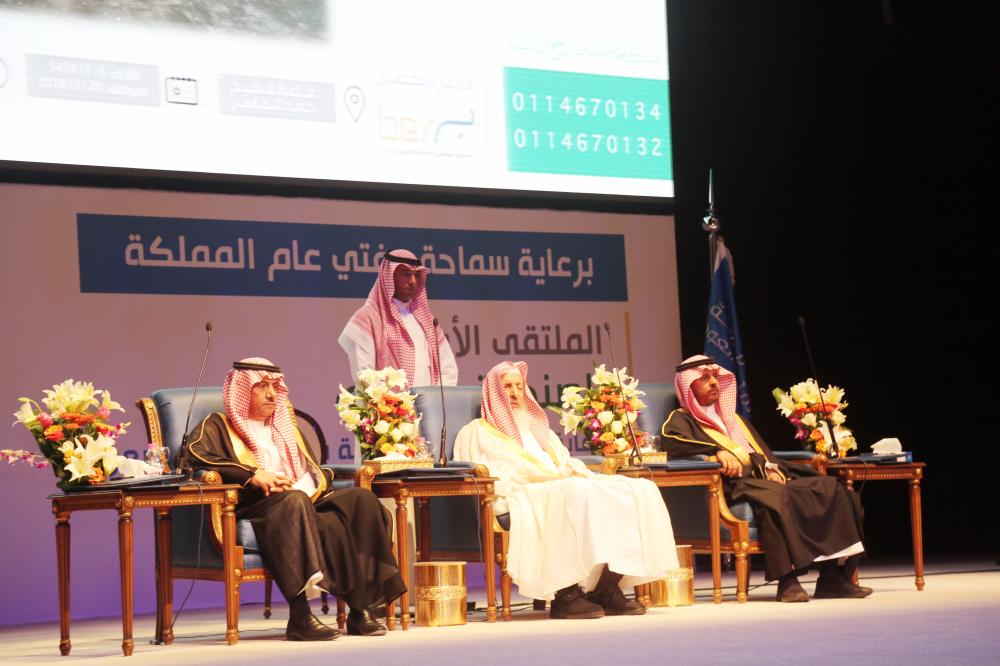 المفتي العام وبجانبه بدران العمر في الملتقى الأول لطلاب المنح الدراسية بجامعة الملك سعود. (عكاظ)