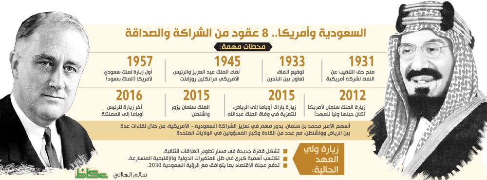 تتجذر العلاقات السعودية الأمريكية في عمق تاريخي يعود لثلاثينات القرن الماضي، وتحالف قوي إستراتيجي تمخضت عنه الكثير من الشراكات التي تقوم على التنمية والأمن وتبادل المصالح والمنافع، تعززه المواقف المشتركة والثابتة حيال الكثير من القضايا المهمة بين البلدين وشعبيهما، إذ تجيء زيارة ولي العهد نائب رئيس مجلس الوزراء وزير الدفاع الأمير محمد بن سلمان إلى أمريكا في سياق هذه العلاقات المتينة الممتدة منذ اللقاء التاريخي بين المؤسس الملك عبدالعزيز آل سعود والرئيس الأمريكي فرانكلين روزفلت، لكنها تصطبغ اليوم برؤية أكثر تقدمية وأعمق نفعية وأكثر تنوعاً، منبثقة عن عزم في صياغة هذه العلاقة على المدى البعيد، وحزم في المواقف إزاء القضايا والأحداث المرتبطة بمستقبل المملكة.