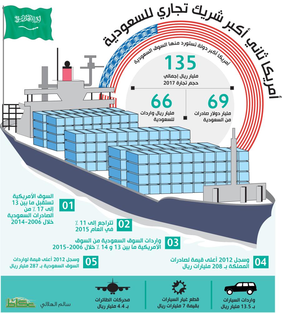 وبناء على البيانات الأولية لعام 2017 الصادرة من الهيئة العامة للإحصاء تحتل الولايات المتحدة الأمريكية المرتبة الثانية في حجم التبادل التجاري للمملكة مع دول العالم بعد جمهورية الصين الشعبية التي تتصدر حجم التبادل التجاري مع السعودية بمقدار 135 مليار ريال، بواقع 69 مليار ريال تمثّل صادرات المملكة إلى الولايات المتحدة، التي تشكّل ما نسبته 51% من حجم التبادل التجارية للمملكة مع الولايات المتحدة.