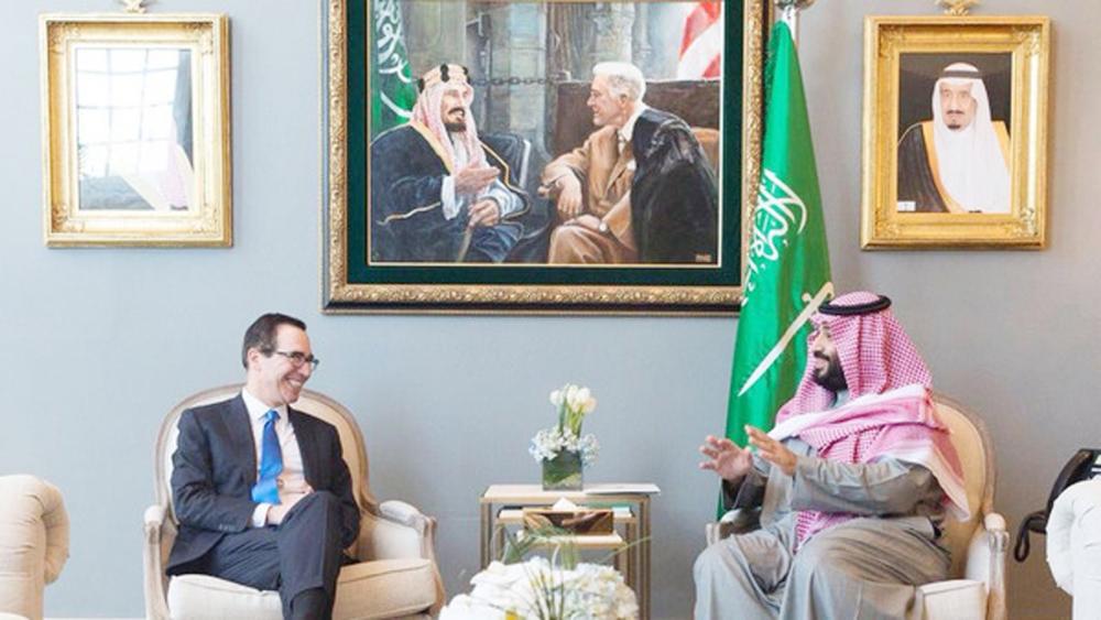 ولي العهد خلال لقائه وزير الخزانة الأمريكي أمس الأول. (واس)