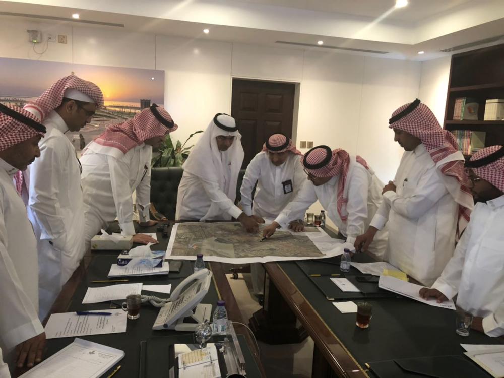 الجبير وحضور الاجتماع يتسعرضون تصاميم الطرق الشريانية. (عكاظ)