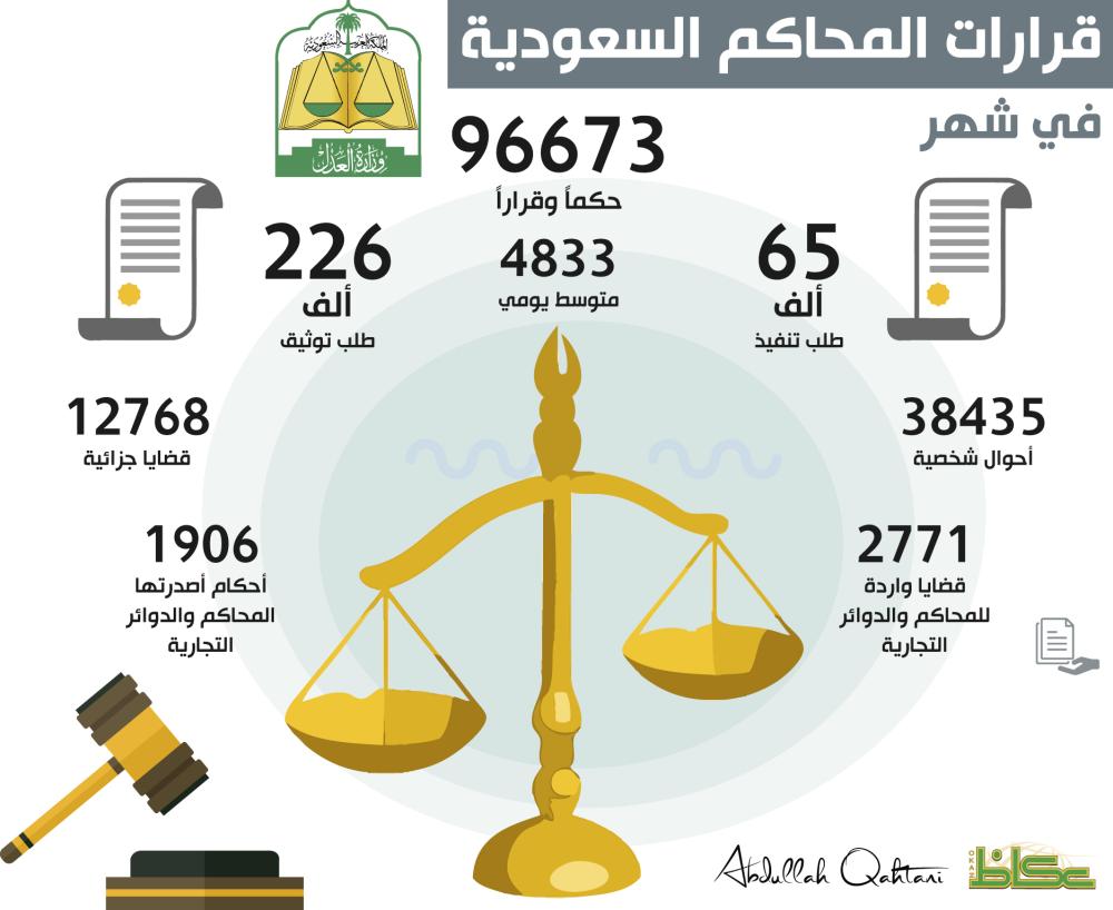 أصدرت المحاكم السعودية خلال شهر جمادى الآخرة الماضي 96673 حكماً وقراراً، بمتوسط يومي يقدر بـ4833 حكماً وقراراً، فيما قدمت كتابات العدل خلال الفترة ذاتها 226 ألف عملية توثيق بمعدل يومي يقدر بـ11300 عملية توثيق.