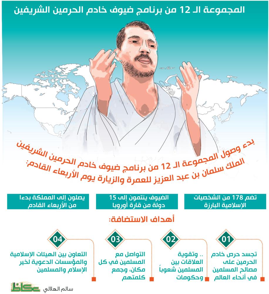أعلن وزير الشؤون الإسلامية والدعوة والإرشاد المشرف العام على برنامج ضيوف خادم الحرمين الشريفين للحج والعمرة الشيخ صالح بن عبدالعزيز آل الشيخ، بدء وصول المجموعة الـ 12 من برنامج ضيوف خادم الحرمين الشريفين الملك سلمان بن عبدالعزيز للعمرة والزيارة يوم الأربعاء القادم، وتضم 178 من الشخصيات الإسلامية البارزة من 15 دولة أوروبية كان قد صدر أمر خادم الحرمين الشريفين باستضافتهم لأداء مناسك العمرة.