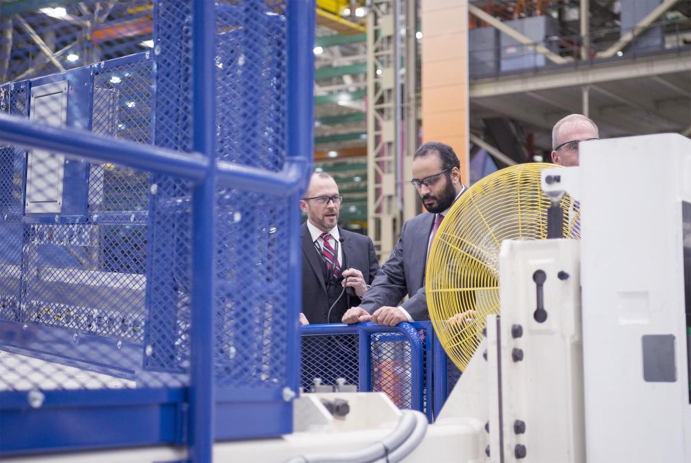 وتجول ولي العهد في مرافق شركة بوينج لصناعة الطائرات، مستمعاً إلى شرح مفصل عن عمليات الشركة.