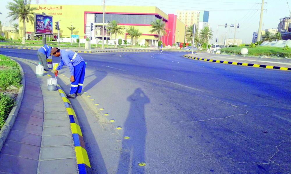 عمال يزينون شوارع الجبيل. (عكاظ)