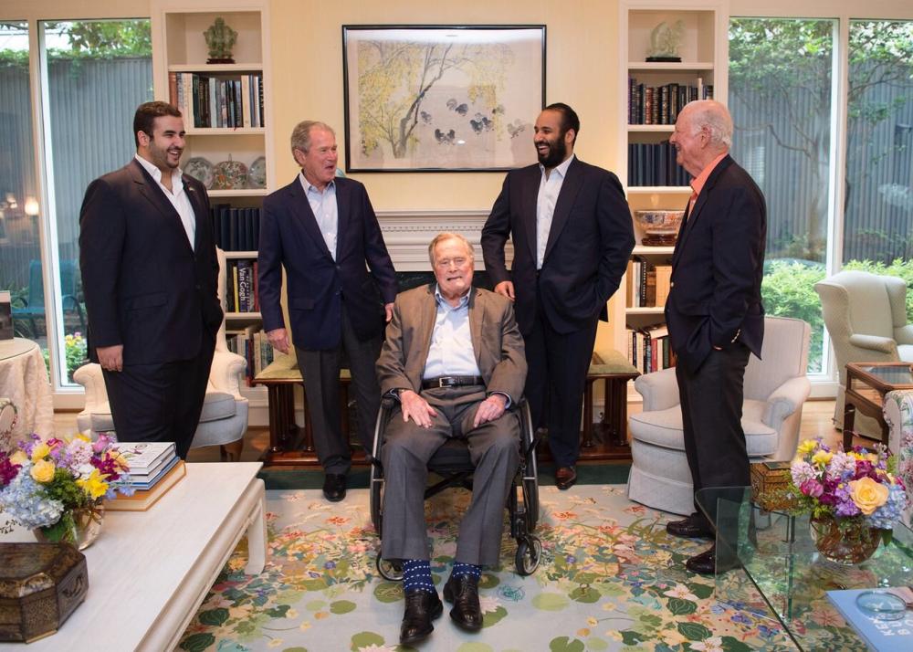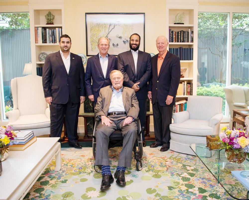 التقى ولي العهد الأمير محمد بن سلمان بن عبدالعزيز الرئيس الأمريكي الـ41 جورج بوش الأب، والرئيس الـ43 جورج بوش الابن، ووزير الخارجية الأمريكي السابق جيمس بيكر، في منزل بوش الأب بمدينة هيوستن أمس (السبت)، برفقة سفير خادم الحرمين الشريفين لدى واشنطن الأمير خالد بن سلمان.