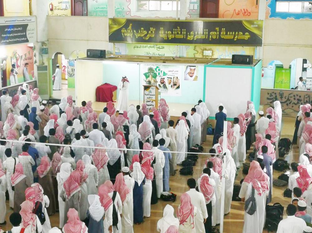 عدد من الطلاب انتظموا في مدرستهم بمكة أمس. (عكاظ)