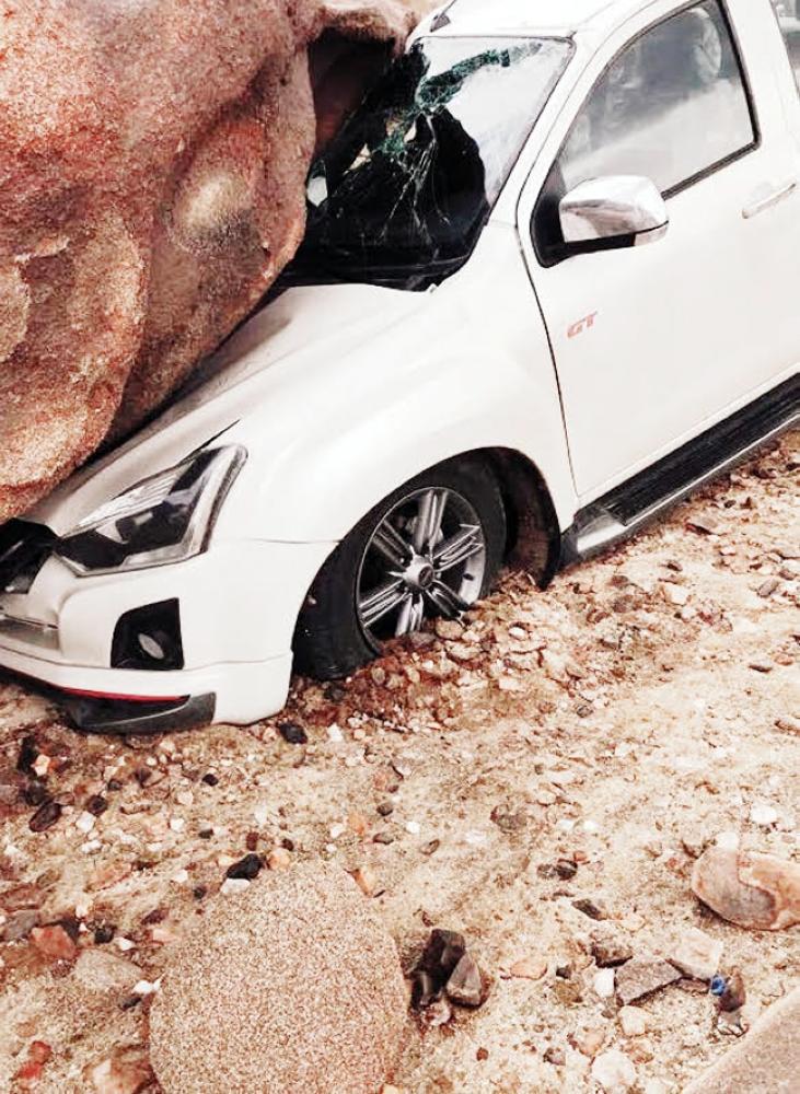 الصخرة بعد سقوطها على مركبة العائلة. (عكاظ)
