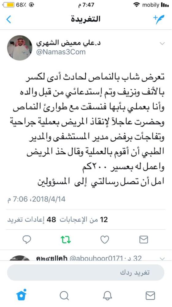 طالب استشاري الأنف والأذن والحنجرة، الأستاذ بكلية الطب بجامعة الملك خالد، الدكتور علي الشهري، الجهات المختصة في وزارة الصحة بالتحقيق مع إدارة مستشفى النماص، التي لم تسمح له بعلاج حالة حرجة لشاب تعرض لحادثة، وأصيب بنزيف وكسر في أنفه.