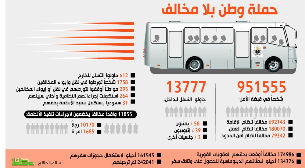 وأشارت الحملة إلى أن إجمالي من يتم إخضاعهم حالياً لإجراءات تنفيذ الأنظمة بلغ (11855) وافداً مخالفاً، منهم (10170) رجلاً، و(1685) امرأة، بينما تم إيقاع العقوبات الفورية بحق (174986) مخالفاً، وإحالة (134376) مخالفاً لبعثاتهم الدبلوماسية للحصول على وثائق سفر، وإحالة (161545) مخالفاً لاستكمال حجوزات سفرهم، وترحيل (242041) مخالفاً.