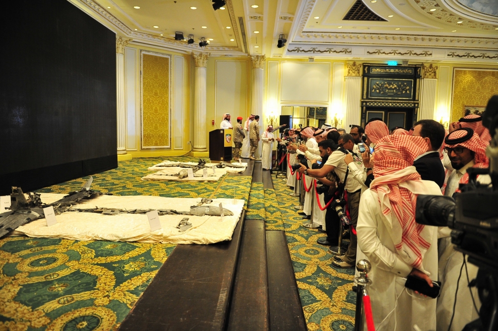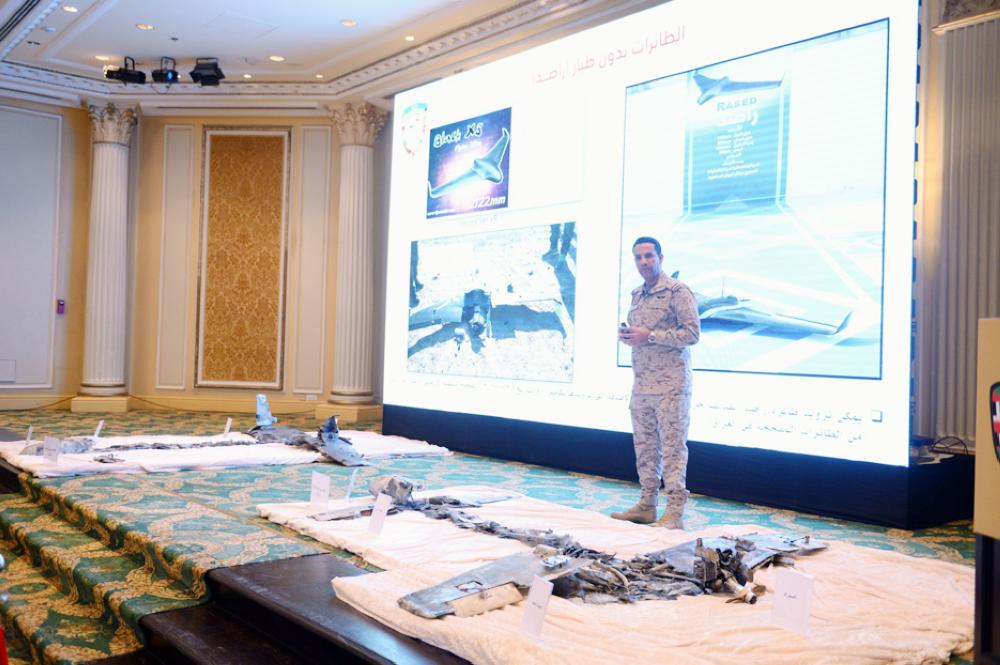 وعرض المالكي صورا لحطام طائرة بعد إسقاطها في سماء جازان، وقبيل الوصول إلى المطار المستهدف، وقال «تقرير فريق الخبراء لعام 2018 تناول تزويد إيران للحوثيين بالطائرات دون طيار، والأجهزة المشغلة لها».