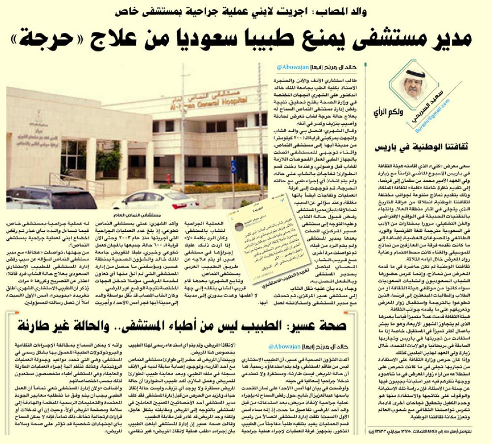ورد الأستاذ بكلية الطب بجامعة الملك خالد الدكتور علي معيض الشهري على بيان الشؤون الصحية بمنطقة عسير، الذي بررت فيه منع الطبيب من إجراء الجراحة بسبب عدم حرج الحالة، واستقرارها، وأنه ليس من طاقم المستشفى، كاشفا لـ «عكاظ» تفاصيل ما حدث بعدما استنجد به والد الشاب محمد الشهري -17 سنة - وقال: «تحدثت هاتفيا عبر جوال قريب الشاب مع مدير المستشفى، وتوسلت إليه لقبول الحالة، لكنه رفض، الأمر الذي أجبر الشاب مع قريبه للبحث عن مستشفى آخر لإسعافه، إذ لم يتم علاجه سواء بمستشفى النماص أو مستشفى عسير، وإنما في مستشفى خاص على حساب والده».