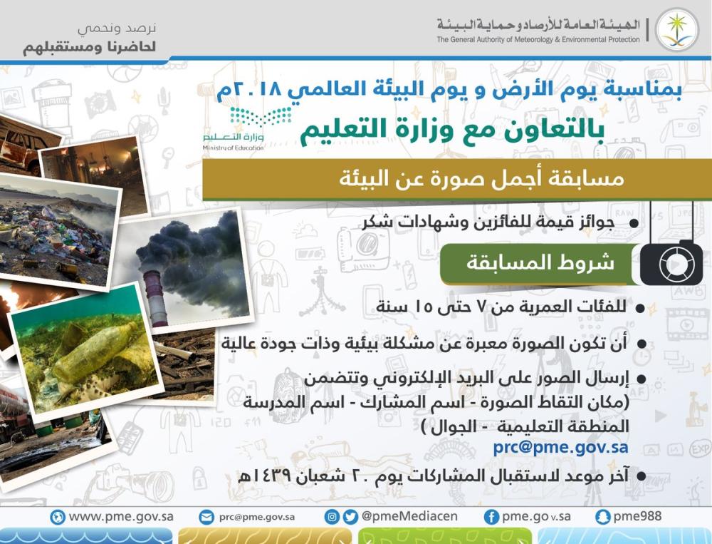 تطلق الهيئة العامة للأرصاد وحماية البيئة بالتعاون مع وزارة التعليم، في إطار التعاون على نشر التوعية البيئية بين كافة أفراد المجتمع مسابقة إلكترونية لأجمل صورة بيئية، ومسابقة أفضل 1000 رسمة بيئية تزامنا مع اليوم العالمي للأرض واليوم العالمي للبيئة تحت شعار «التغلب على التلوث البلاستيكي»، وتقيم الهيئة كذلك أنشطة ومعارض مختلفة بمناسبة الحدثين العالميين بهدف رفع الوعي البيئي لدى مختلف شرائح المجتمع.