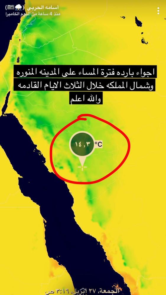 نشر ناشطون ومهتمون بأحوال الطقس وتتبع أخبار الأمطار على مواقع التواصل الاجتماعي خرائط جوية وكشوفات توضح أن المدينة المنورة وشمال المملكة ستعيش على مدى 3 أيام ابتداء من أمس (الجمعة) حالة من الأجواء الباردة فترة المساء تصل إلى 14.3 درجة مئوية، وهي أجواء تعيدنا إلى الشتاء.