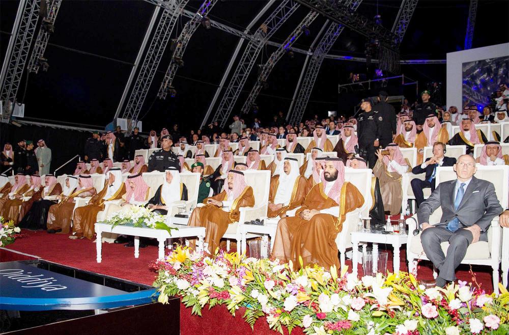 ولدى وصول خادم الحرمين الشريفين مقر الحفل، كان في استقباله أمير منطقة الرياض الأمير فيصل بن بندر بن عبدالعزيز، وولي العهد نائب رئيس مجلس الوزراء وزير الدفاع الأمير محمد بن سلمان بن عبدالعزيز، ونائب أمير منطقة الرياض الأمير محمد بن عبدالرحمن بن عبدالعزيز، ووزير الداخلية الأمير عبدالعزيز بن سعود بن نايف بن عبدالعزيز. كما كان في استقبال الملك سلمان الأمين العام للمجلس التأسيسي لمشروع القدية في صندوق الاستثمارات العامة الدكتور فهد بن عبدالله تونسي، ومحافظ ضرما سلطان بن سعد السديري. ثم عزف السلام الملكي.