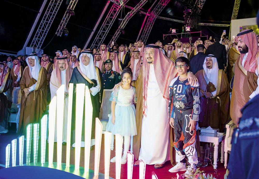 ثم أديت أغنية من كلمات الأمير بدر بن عبدالمحسن بن عبدالعزيز، وأداء الفنان عايض يوسف، بعدها شاهد خادم الحرمين الشريفين والحضور عرضاً مسرحياً يحاكي التطور الذي تعيشه المملكة في ظل القيادة وتوجيهاتها السديدة للاستفادة من الإمكانيات الهائلة وتحقيقها الأهداف المطروحة التي تتضمنها رؤية 2030، بالإضافة إلى ما يتضمنه مشروع القدية من متنزهات ترفيهية وأنشطة رياضية ومشاهد طبيعية.