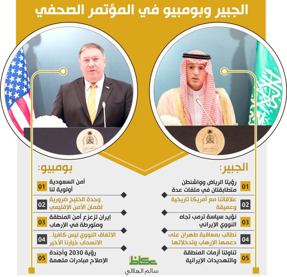 وبيّن في مؤتمر صحفي مشترك مع وزير الخارجية الأمريكي مايكل بومبيو، عقده أمس (الأحد) في الرياض، أن الاجتماعات مع الوزير الأمريكي في إطار زيارته لمنطقة الشرق الأوسط، كانت إيجابية وبناءة ومثمرة، وتم التطرق للعلاقات الثنائية بين البلدين وسبل تعزيزها وتكثيفها في مختلف المجالات، وتم استعراض التحديات في المنطقة، سواءً في لبنان وسورية والعراق أو تدخلات إيران السلبية في المنطقة، إضافة إلى الوضع في اليمن، ودعم الدول الخمس في الساحل الأفريقي وطرق التعامل مع الأزمة في ليبيا، مشيراً إلى تطابق الرؤى بين الجانبين والرغبة في تكثيف العمل بجهود مشتركة للتعامل مع هذه الأمور.