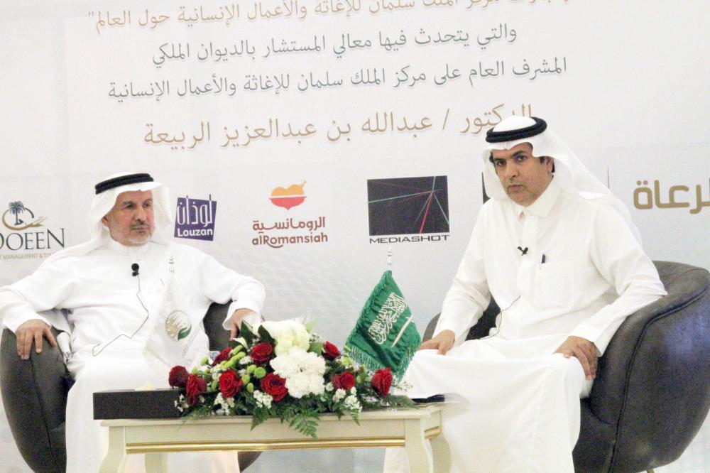 وقال الربيعة في ندوة بعنوان: «إنجازات مركز الملك سلمان للإغاثة والأعمال الإنسانية حول العالم» نظمها ملتقى «صحافيون» مساء أمس الأول (الأحد)، في فندق أوليان بالرياض، إن المملكة عبر تاريخها الحافل انتهجت دوراً رائداً في العمل الإنساني والإغاثي من خلال خدمة المجتمع الدولي، إدراكاً منها لأهمية هذا الدور في تخفيف المعاناة الإنسانية ولضمان الحياة الكريمة والسليمة للضعفاء والمحتاجين.