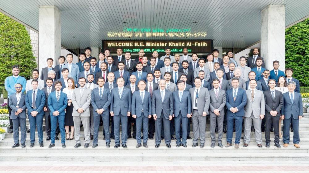 خالد الفالح في صورة جماعية مع المهندسين السعوديين في معهد أبحاث الطاقة الذرية الكوري أمس. (واس)