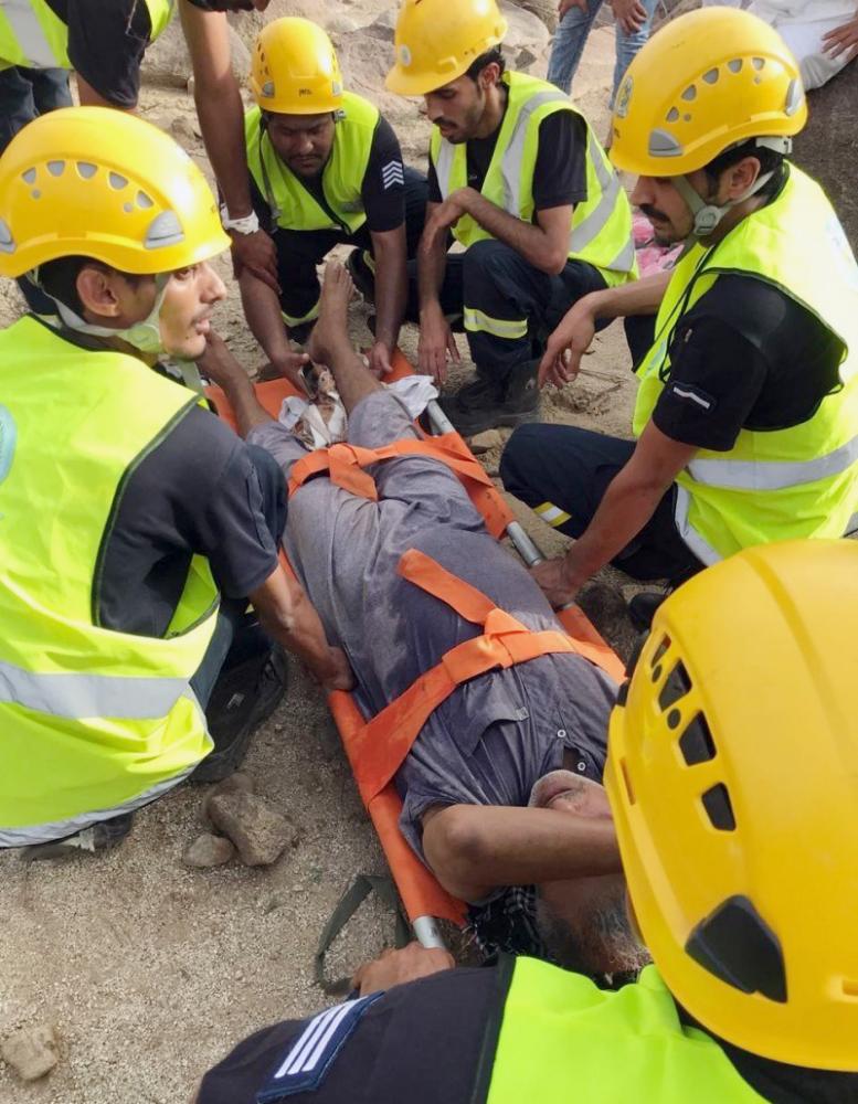 أفراد الدفاع المدني أثناء نقل المصاب من قمة الجبل.