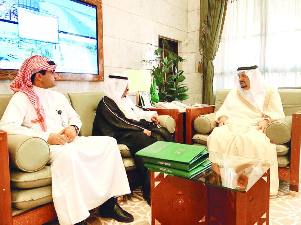الأمير فيصل بن بندر مستقبلا المديرس. (عكاظ)