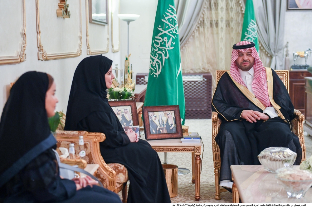الأمير فيصل بن خالد مستقبلا هلا التويجري. (عكاظ)
