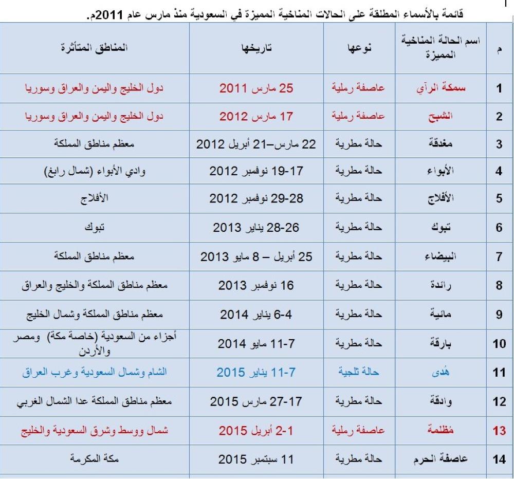 وشهدت المملكة 29 حالة مناخية وفق تسجيل «تسميات»، والتي أطلقت مسمى سمكة الراي على أول عاصفة رملية عقب إطلاق اللجنة الخاصة بالتسمية، وكانت في 2011 قبل أن تتولى التسميات (الشبح، مغدقة، الأبواء، الأفلاج، تبوك، البيضاء، رائدة، مائية، بارقة، هدى، وادقة، مظلمة، عاصفة الحرم، سابغة، عاصفة الشرق الثلجية، عالية، غامرة، سدود، ربى، الرباب، رحمة، جود، عاصفة مدار، السروات، بشرى، فيض، عاصفة، هبوب).