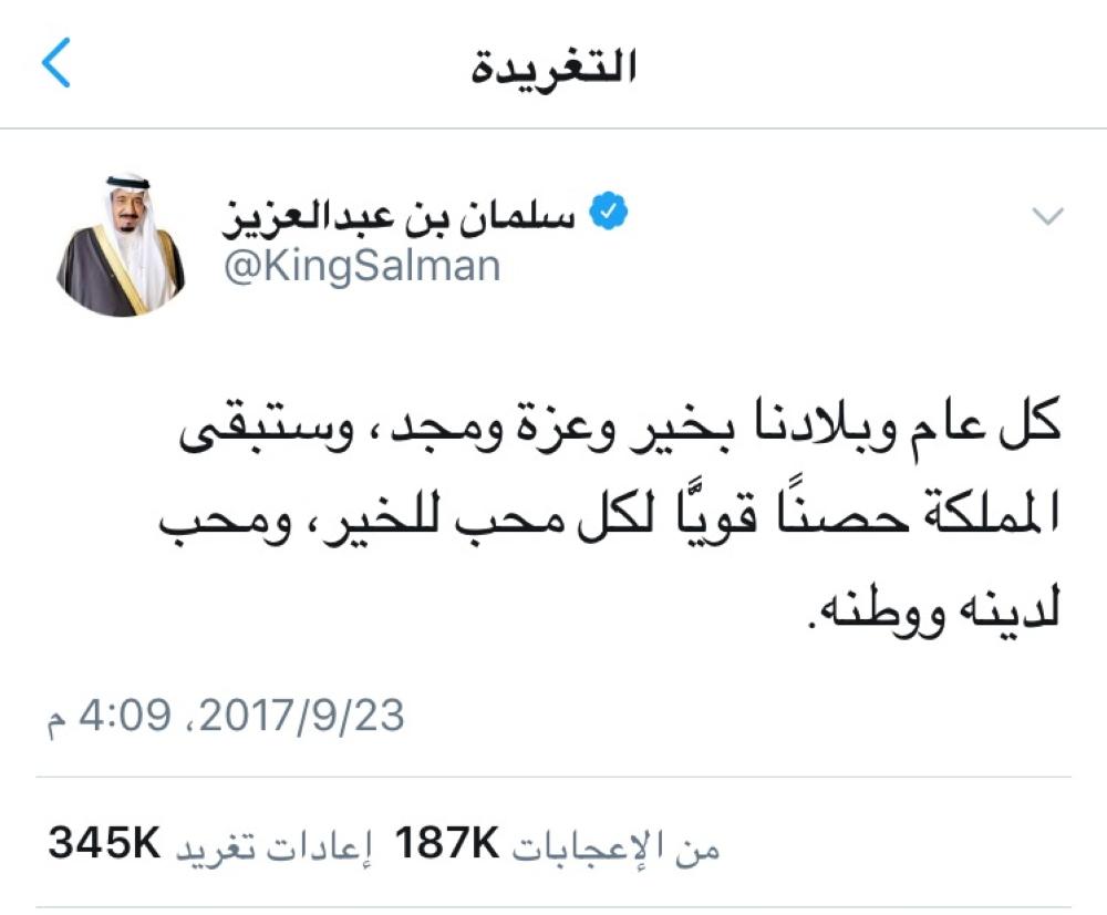 حلت تغريدة خادم الحرمين الشريفين الملك سلمان بن عبدالعزيز بمناسبة اليوم الوطني من أكثر 100 تغريدة تفاعلا في العالم عام 2017، والأولى عربياً.